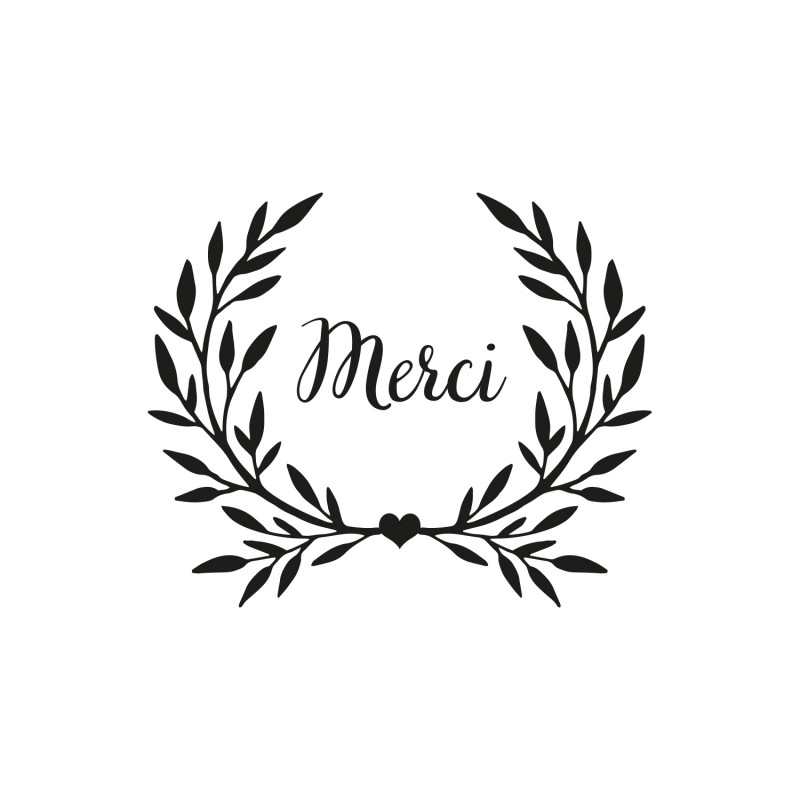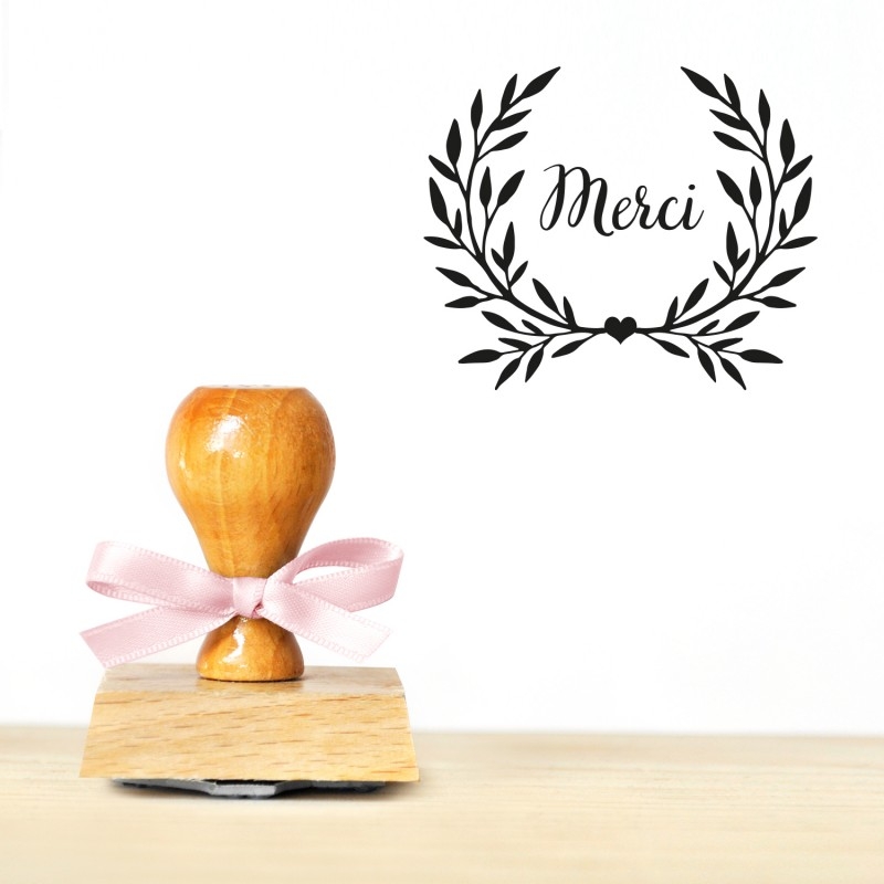 Tampon en bois avec l'inscription "Merci" entouré de feuillage pour décorer vos cadeaux d'invités et les enveloppes de vos remerciements. Une délicate attention qui fera plaisir à vos proches.