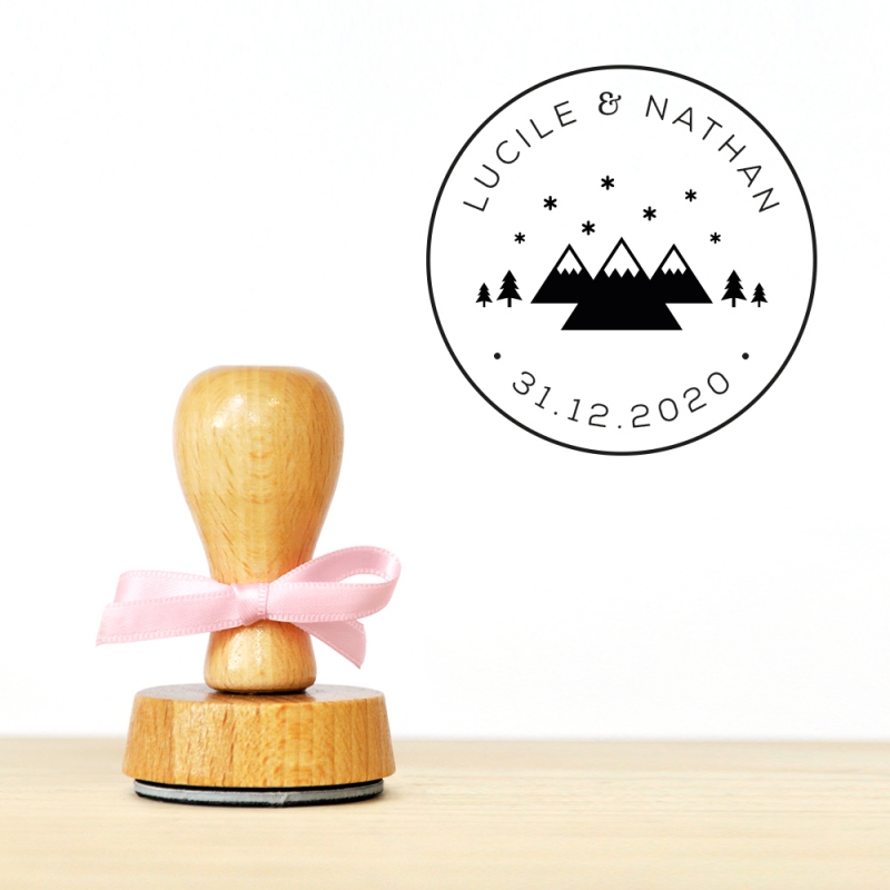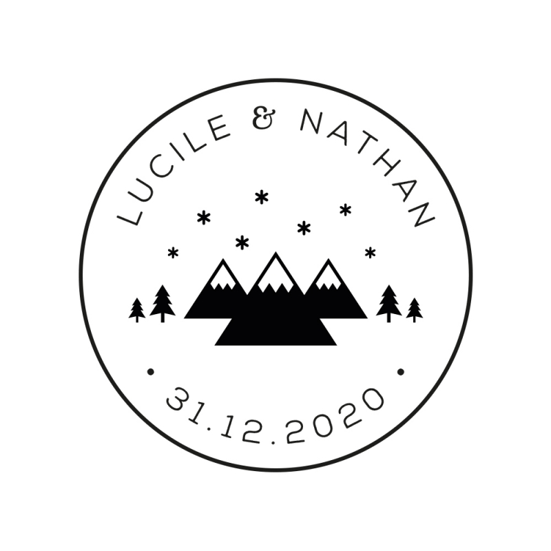 Tampon mariage rond personnalisé, illustration hivernale montagnes