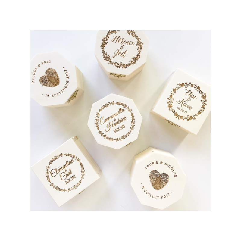 Chaque boîte peut être achetée avec un porte-alliances en bois personnalisé ou non. La commande comprend la gravure extérieure de la boîte (et celle du porte-alliances en option) avec les textes de votre choix.