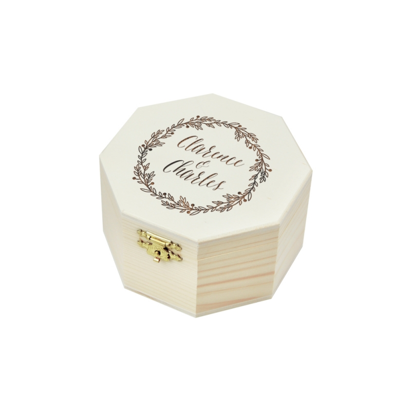 Pour votre mariage champêtre, laissez-vous séduire par cette boîte à alliances originale. Vos prénoms seront finement gravés sur le couvercle en bois brut de la boîte. Octogonale ou carrée, elle accueillera parfaitement vos alliances avant le jour J !