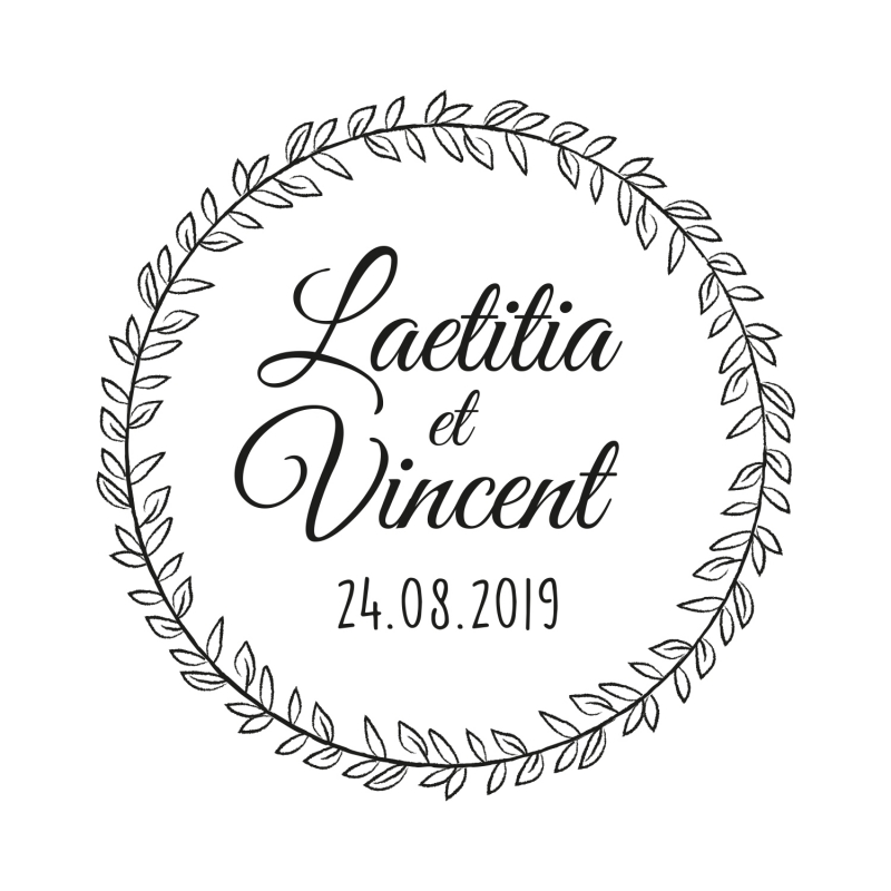Laissez-vous séduire par la jolie couronne végétale de ce tampon encreur pour votre mariage champêtre et nature. Elle illustrera parfaitement votre thème de mariage. Vous pouvez utiliser ce tampon sur support papier et textile.