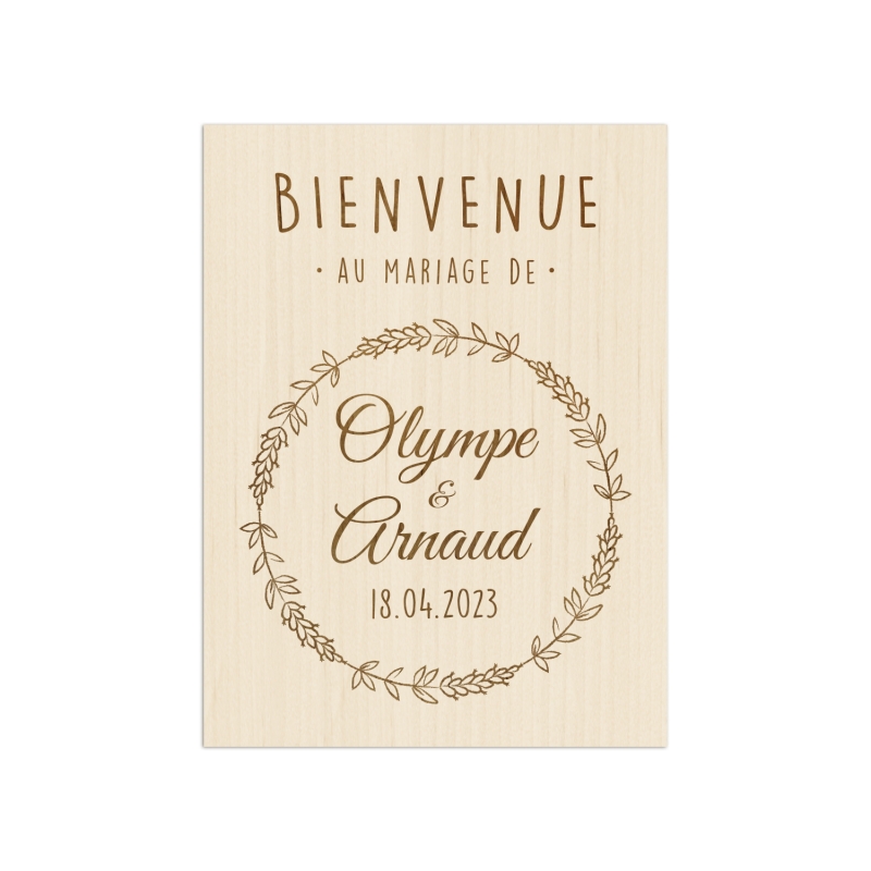 Décorez l'entrée de votre lieu de réception avec un joli panneau de bienvenue en bois. Ce modèle est illustré d'une couronne de lavande pour rappeler à vos invités le doux parfum de la Provence. Cette décoration originale en bois est une invitation à entrer dans votre lieu de réception.