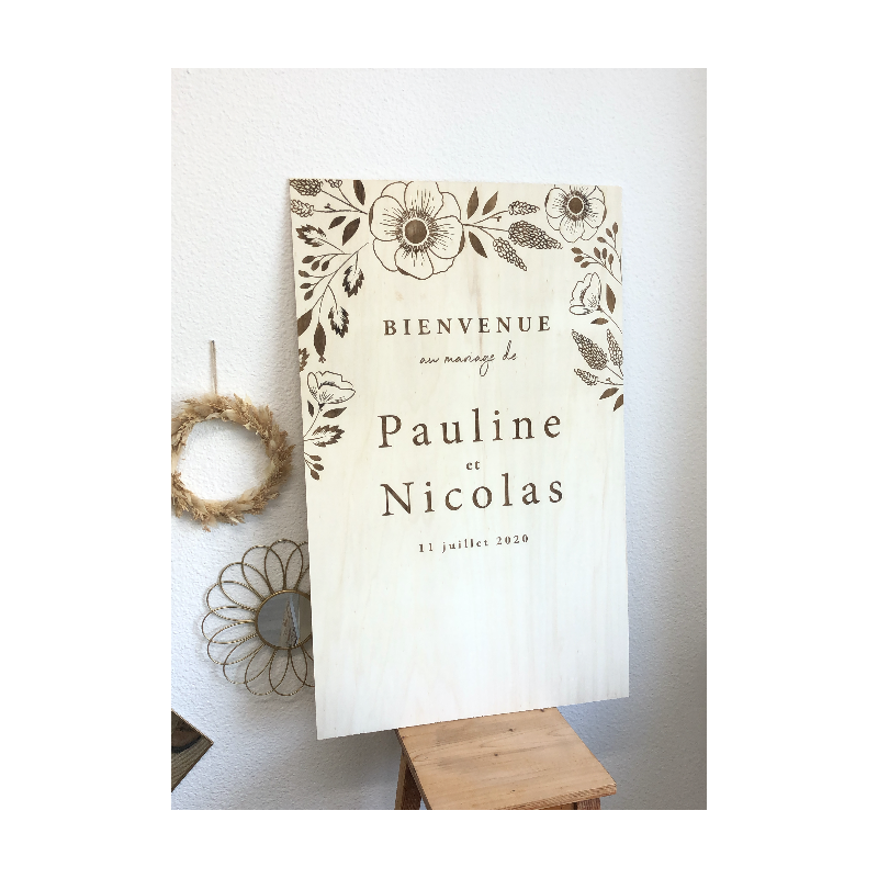 La commande du panneau en bois comprend la personnalisation avec vos prénoms et la date de votre mariage, ainsi que sa fabrication. Vous avez également la possibilité de choisir l'option "Ajout de plexiglas" sur vos prénoms (en sus).
