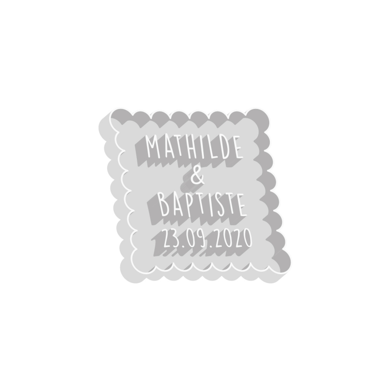 Offrez de jolis biscuits fait-maison à vos invités à l'occasion de votre mariage. Grâce à cet emporte-pièce personnalisé, vous pourrez réaliser des cadeaux pour vos invités fait avec amour. Ce modèle en forme de petit lu est personnalisable avec vos prénoms et la date de votre mariage.