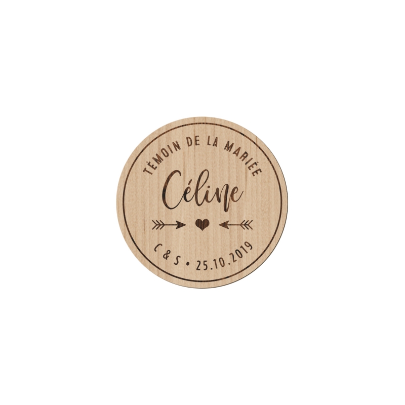 Offrez à vos témoins et à vos proches de jolis badges personnalisés. Finement gravé dans du bois brut, vous pourrez les personnaliser avec un prénom, un "titre" (exemple : Maman de la mariée) et vos initiales et date de mariage en petit. Ainsi, tous vos convives pourront identifier vos témoins ou proches le jour J. C'est également un cadeau original qu'ils garderont précieusement.