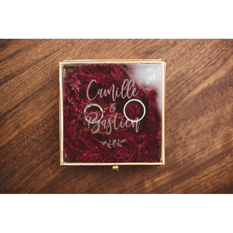 Très jolie boîte à alliances en verre personnalisable avec vos prénoms et la date de votre mariage. Fabriquée en verre et en métal vieilli doré, elle fera son effet lors de l'échange des alliances.