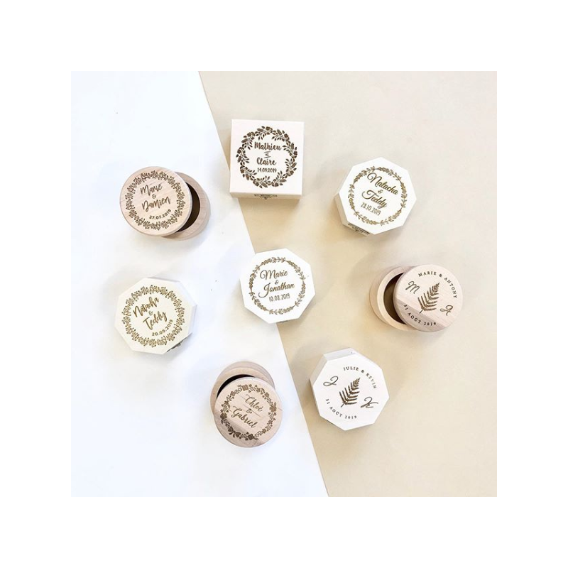 Chaque boîte peut être achetée avec un porte-alliances en bois personnalisé ou non. La commande comprend la gravure extérieure de la boîte (et celle du porte-alliances en option) avec les textes de votre choix.