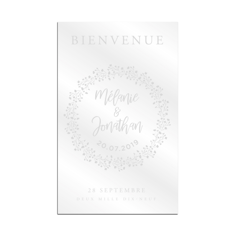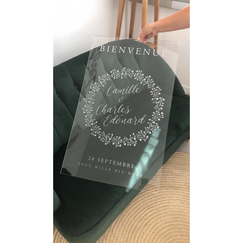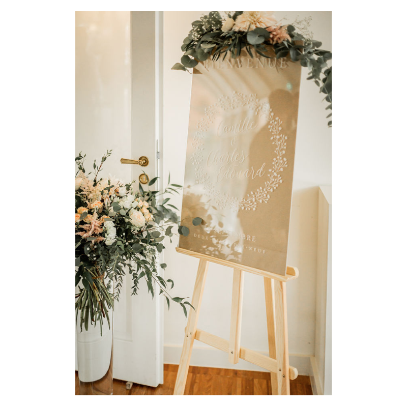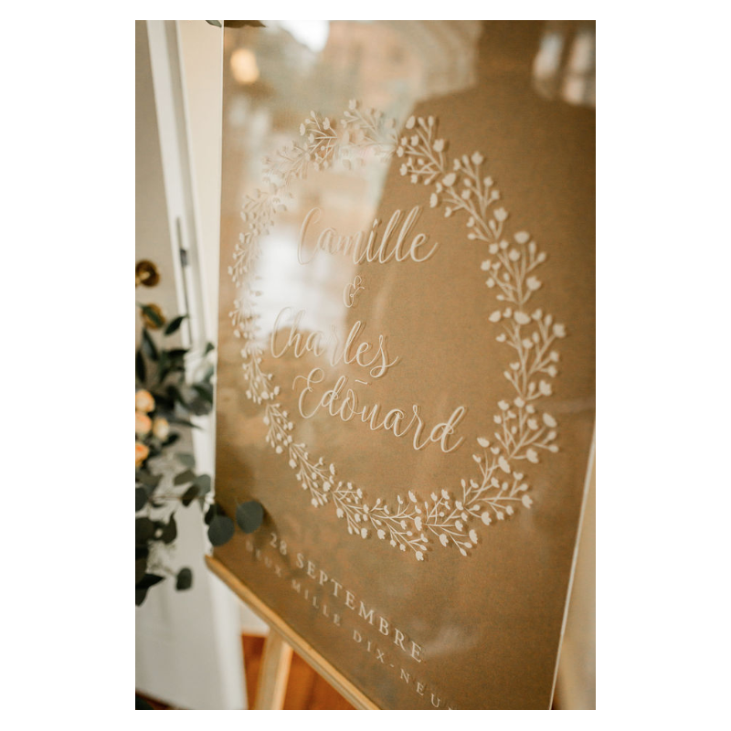 Décorez l'entrée de votre lieu de cérémonie ou de réception avec un joli panneau de bienvenue. Vous allez craquer pour ce modèle avec sa couronne de gypsophile qui entoure avec élégance les prénoms des mariés. Vous pouvez le prendre en bois ou en plexiglas transparent pour qu'il s'adapte à 100% à votre décoration.