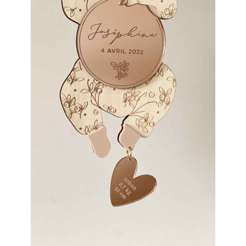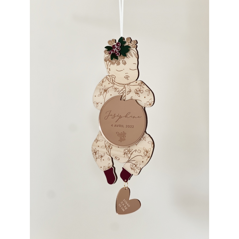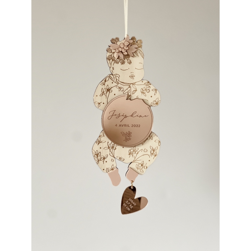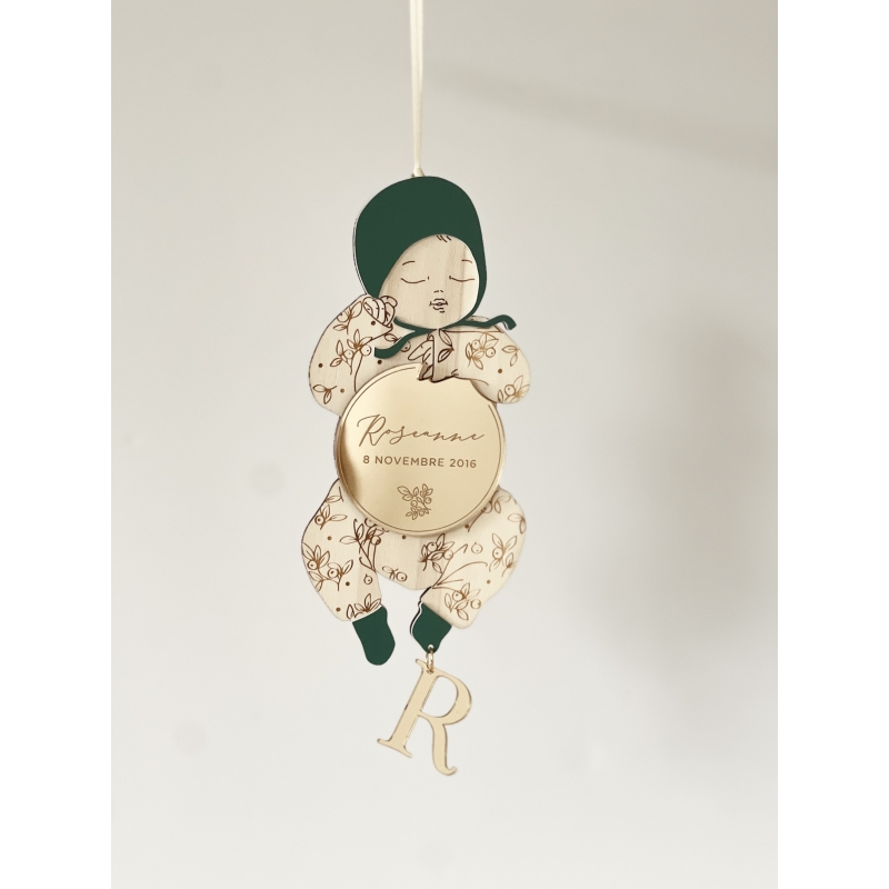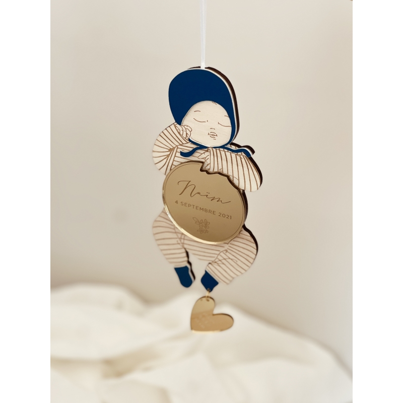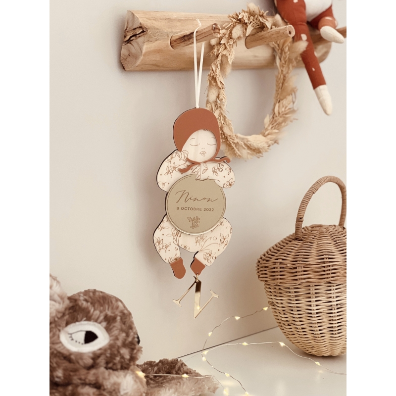 On craque pour cette décoration originale en bois qui sera un joli souvenir de la naissance de votre enfant. Vous pourrez personnaliser votre poupon en lui choisissant un accessoire de tête, un motif pour le pyjama ainsi que les coloris. La breloque en forme d'initiale ou de coeur ajoute une petite touche précieuse à cette pièce pleine de poésie. Un cadeau symbolique à offrir ou s'offrir !