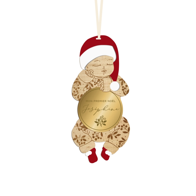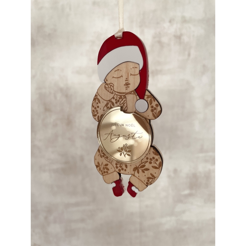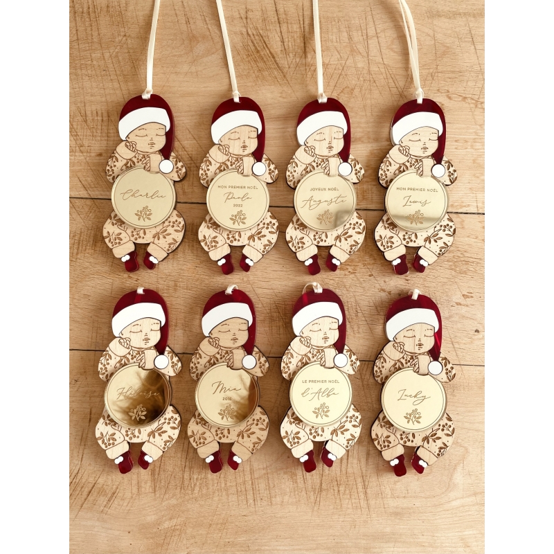 Pour le premier Noël de votre bébé, personnalisez cette jolie suspension de sapin en forme de poupon. On craque pour son illustration douce et poétique et son côté festif avec son bonnet et ses chaussons de Noël. Sur le médaillon en plexiglas miroir champagne, inscrivez son prénom pour en faire une boule de Noël unique et à son image ! Un souvenir symbolique pour marquer son premier Noël.