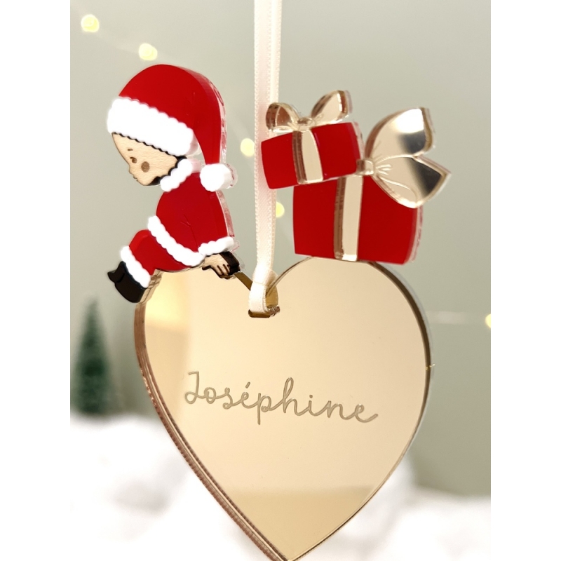 Cette boule de Noël en plexiglas personnalisée apportera un éclat unique à votre sapin. Sur le coeur miroir champagne, inscrivez un prénom pour en faire une décoration unique et originale ! Une décoration toute particulière pour des souvenirs précieux !
