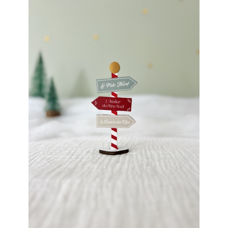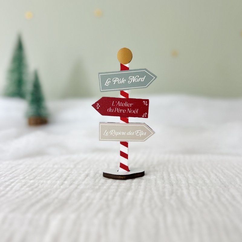 Complétez votre mini monde de Noël en bois peint avec ce panneau directionnel décoratif. Peint dans des tons festifs, il indique les chemins du Pôle Nord, de l’atelier du Père Noël et du repère des Elfes. Une création artisanale pleine d’authenticité pour sublimer votre décor de fêtes