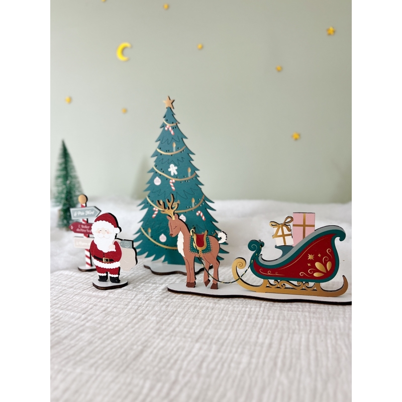 Le moment le plus attendu de Noël prend vie dans cette scènette délicatement réalisée en bois : le Père Noël et son traîneau prêts à s’élancer pour la grande tournée des cadeaux !