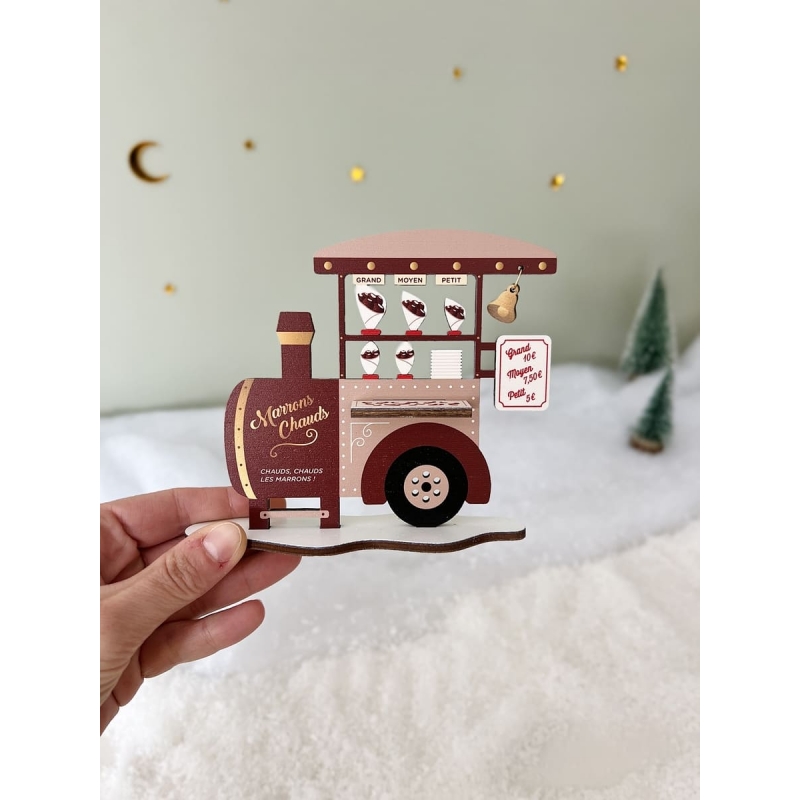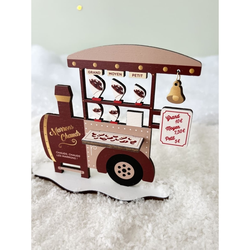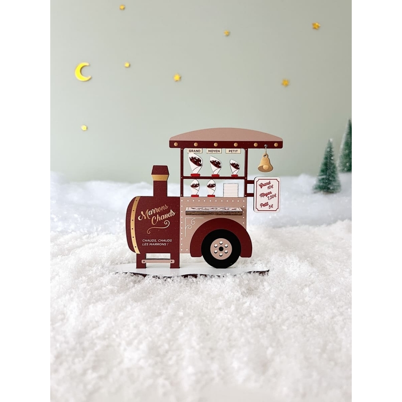 Recréez l’ambiance chaleureuse des marchés de Noël traditionnels avec le stand de marrons chauds en bois. Fabriqué avec soin dans notre atelier en Alsace, il évoque les odeurs de marrons grillés et la convivialité des fêtes. À associer au chalet du vin chaud, à la grande roue ou au chariot de gourmandises pour composer un marché de Noël miniature plein de charme et d’authenticité.