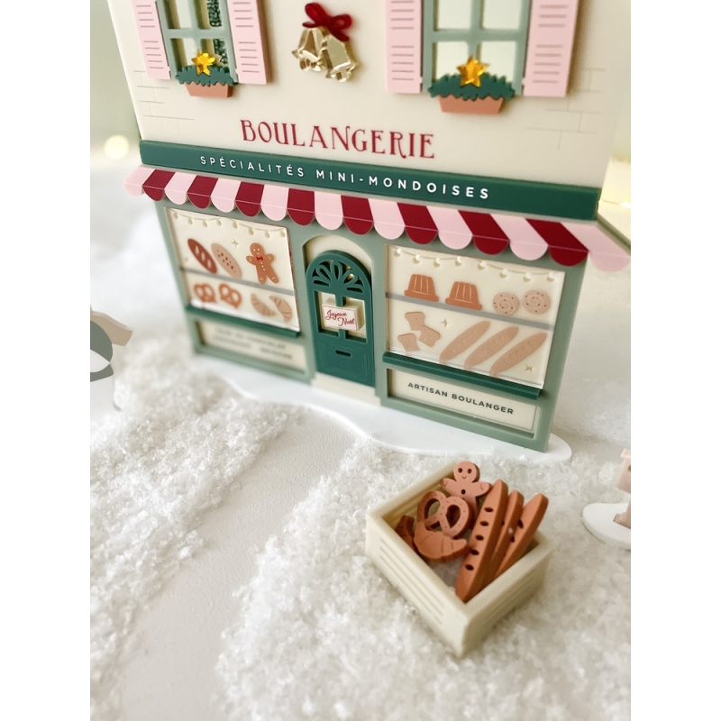 Apportez une touche authentique et chaleureuse à votre Mini monde avec notre boulangerie de Noël. Cette création artisanale en plexiglas est agrémentée d'une vitrine affichant de délicieuses viennoiseries et de bons pains. Son store rouge et rose, ainsi que sa conception laissant passer la lumière à l'arrière, ajoutent un effet magique au village de Noël.