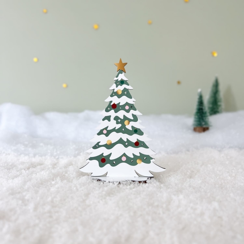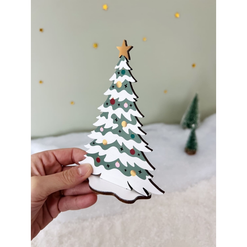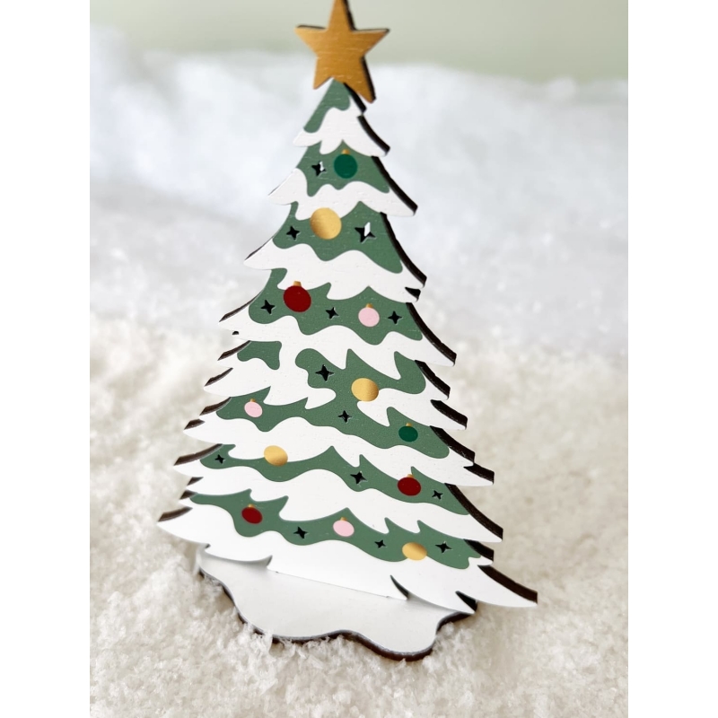 On adore ce joli sapin enneigé en bois décoré de boules de Noël colorées. Il apporte du charme et de l'authenticité à votre village miniature de Noël. Ses couleurs festives et son étoile dorée en font une pièce idéale pour illuminer votre décor en bois.