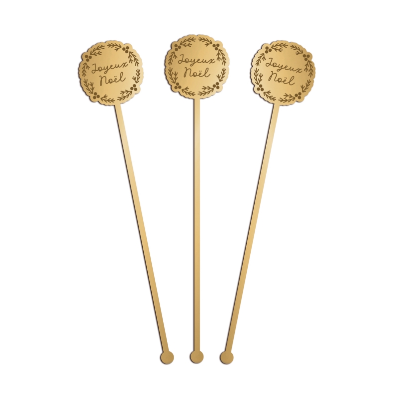 Grâce à ces jolies touillettes en plexiglas, vous pourrez décorer de manière originale et élégance votre table de Noël ! Sur le haut de la touillette est finement gravé une couronne de Noël et le message "Joyeux Noël". Vous pourrez choisir différents coloriés de plexiglas afin de coller à 100% à votre décoration.