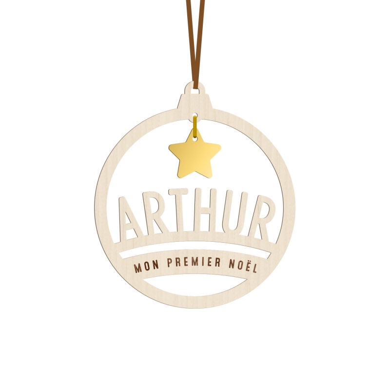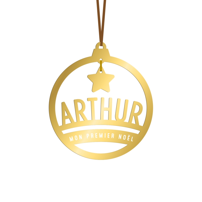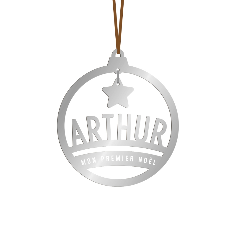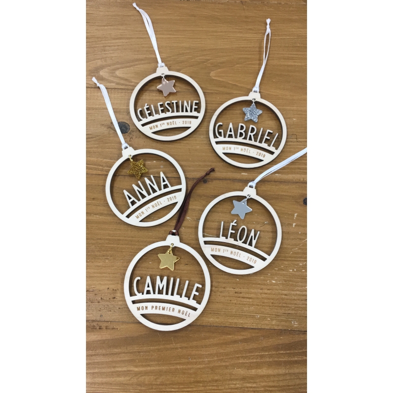 Jolie décoration personnalisée à accrocher à votre sapin de Noël. Sur ce modèle en forme de boule de Noël, le prénom de votre enfant est découpé et l'inscription personnalisée finement gravé. Vous allez adorer sa petite étoile suspendue en plexiglas or ou argent qui la fera briller de mille feux !