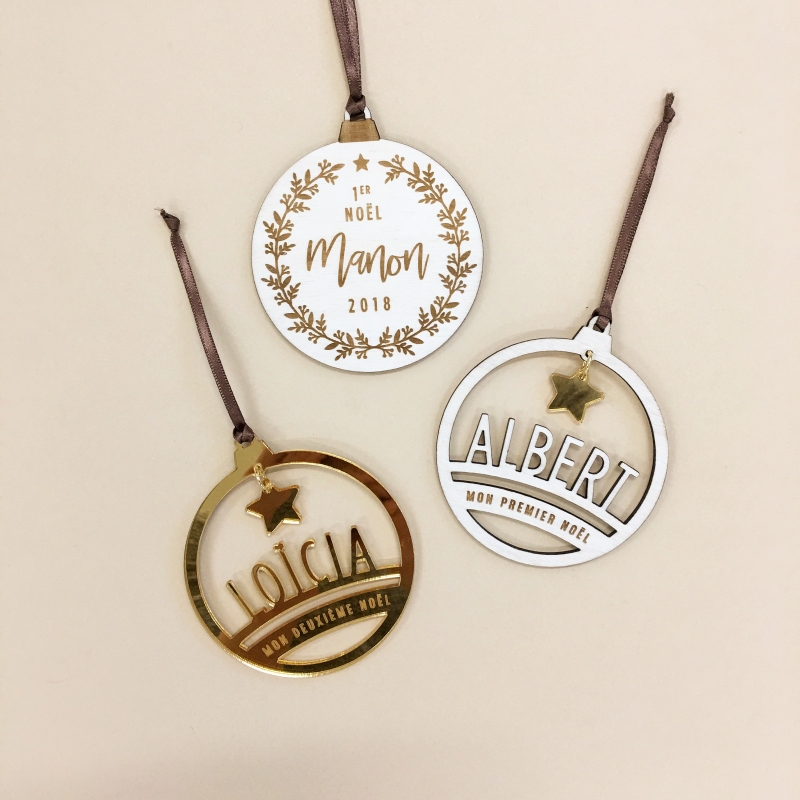 La commande comprend la personnalisation de la boule de Noël, ainsi que la fabrication dans la matière choisie. La décoration est envoyée avec un ruban de satin.