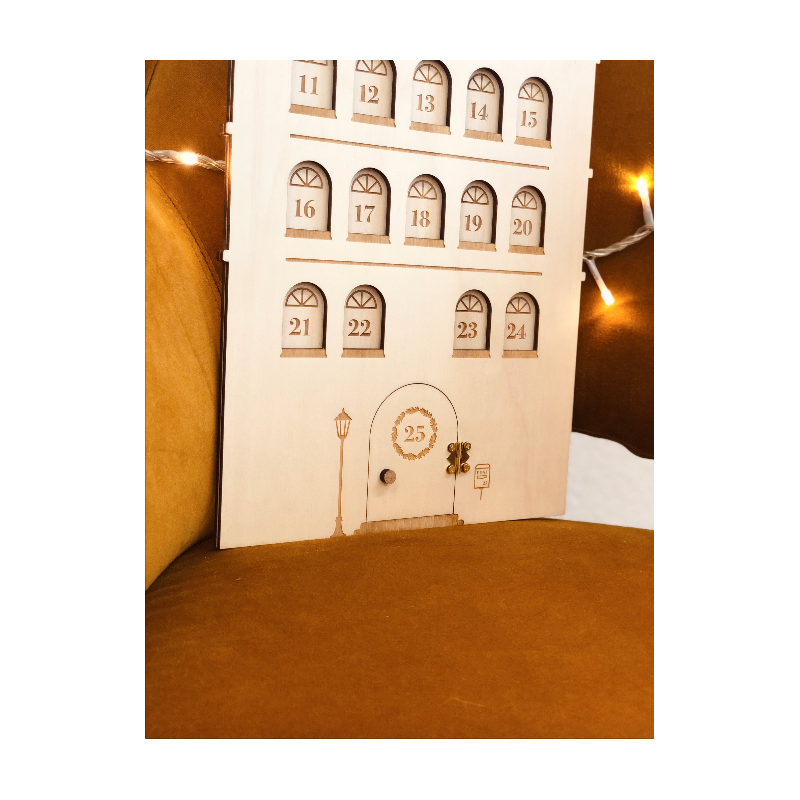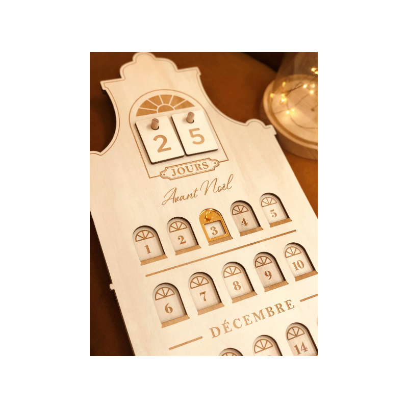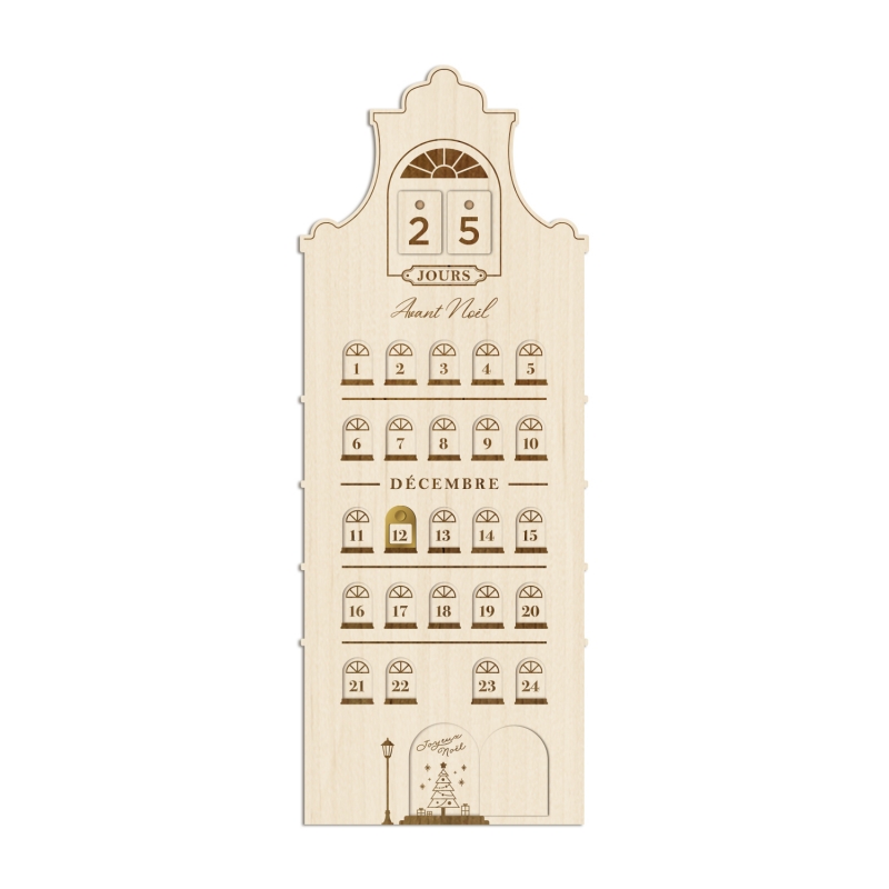 Ce calendrier de l'Avent démarre le 1er décembre et se finit le jour de Noël. Tous les chiffres (du 1 au 24) sont placés dans des fenêtres que vous pourrez mettre en lumière chaque jour grâce au pointeur en plexiglas miroir or. Le 25 décembre est particulièrement mis en valeur : une petite porte à ouvrir laissera apparaître le sapin de Noël.