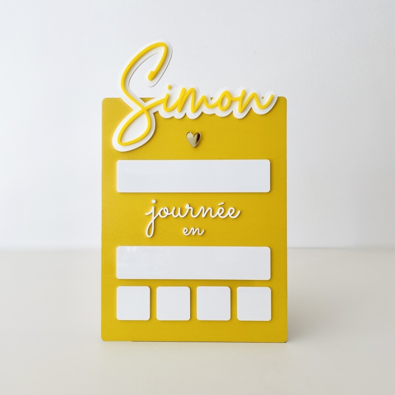 Cette pancarte de rentrée jaune apporte une touche solaire aux souvenirs de votre enfant. En bois peint, avec prénom en plexiglas et zones effaçables, elle s'utilise de la crèche au collège.