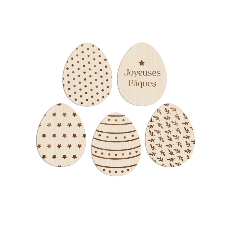 Lot de 5 oeufs en bois peuplier au format 4,8 x 6,2 cm.