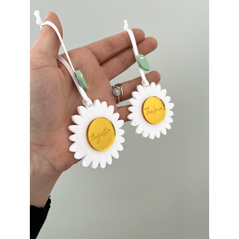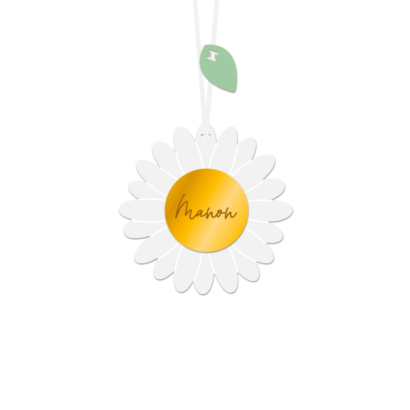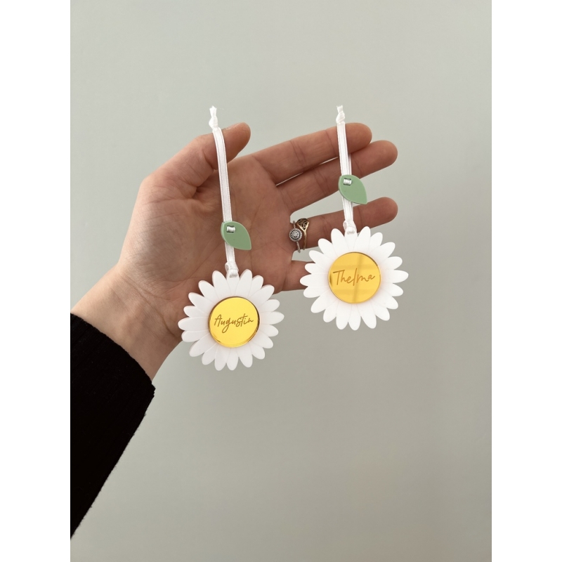 La commande comprend la personnalisation de la suspension pâquerette avec le prénom de votre choix, ainsi que sa fabrication. La décoration est envoyée avec un ruban de satin brun.
