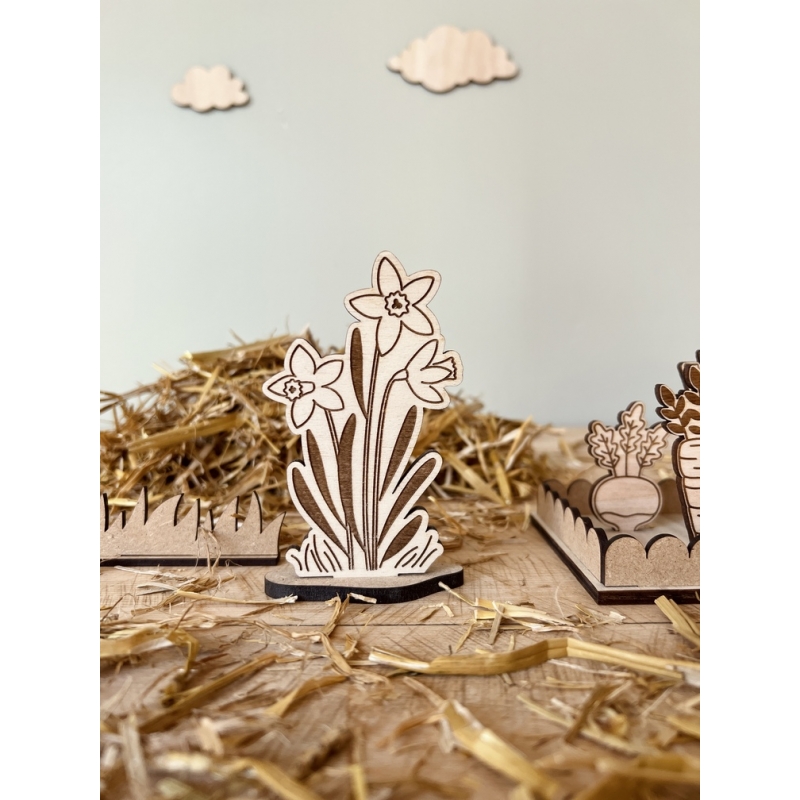 Laissez-vous transporter dans l'univers printanier et poétique de Pâques avec notre joli décor en bois représentant le jardin du lapin de Pâques. La décoration est composée de plusieurs éléments en bois sur socle que vous pourrez placer à votre guise pour que le décor prenne vie. On y retrouve une jolie maison en bois nichée sur un arbre avec sa guirlande d'oeufs de Pâques, sa petite lanterne et son échelle. Dans le jardin se trouve le célèbre lapin de Pâques avec sa carotte, la jolie poule et ses 3 petits poussins, nos deux moutons, de jolies jonquilles, une belle brouette et le petit potager.