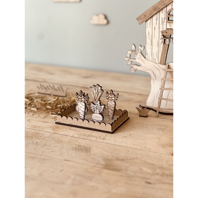 Le jardin du lapin de Pâques a été imaginé et dessiné par nos soins. Chaque pièce est fabriquée et assemblée dans notre atelier alsacien. Le décor en bois vous sera livré monté, il vous suffira de rajouter le socle pour le faire tenir debout.