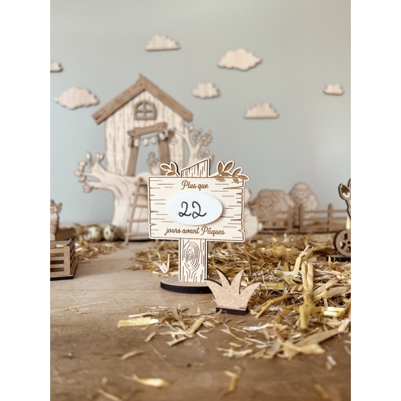 Laissez-vous transporter dans l'univers printanier et poétique de Pâques avec notre joli décor en bois représentant le jardin du lapin de Pâques. La décoration est composée de plusieurs éléments en bois sur socle que vous pourrez placer à votre guise pour que le décor prenne vie. On y retrouve une jolie cabane en bois nichée sur un arbre avec sa guirlande d'oeufs de Pâques, sa petite lanterne et son échelle. Dans le jardin se trouve le célèbre lapin de Pâques avec sa carotte, la jolie poule et ses 3 petits poussins, nos deux moutons, de jolies jonquilles, une belle brouette et le petit potager.
