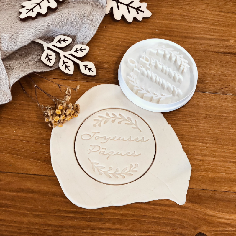 Réalisez des sablés originaux pour Pâques grâce à cet emporte-pièce. Grâce à cette presse, vous pourrez réaliser de jolis biscuits ronds avec la mention "Joyeuses Pâques" entouré de quelques branches végétales.
