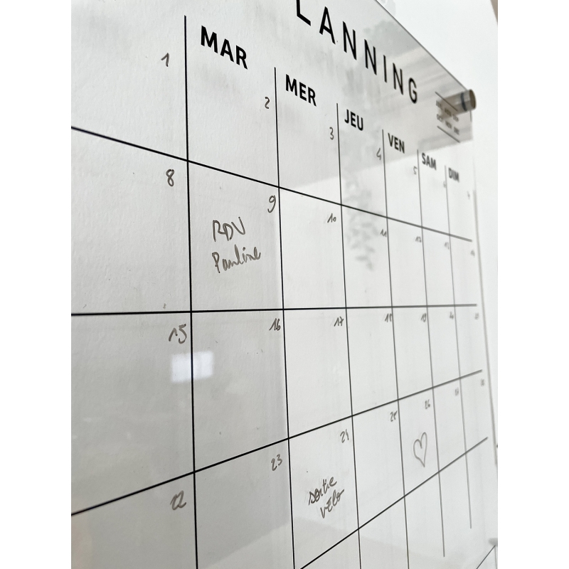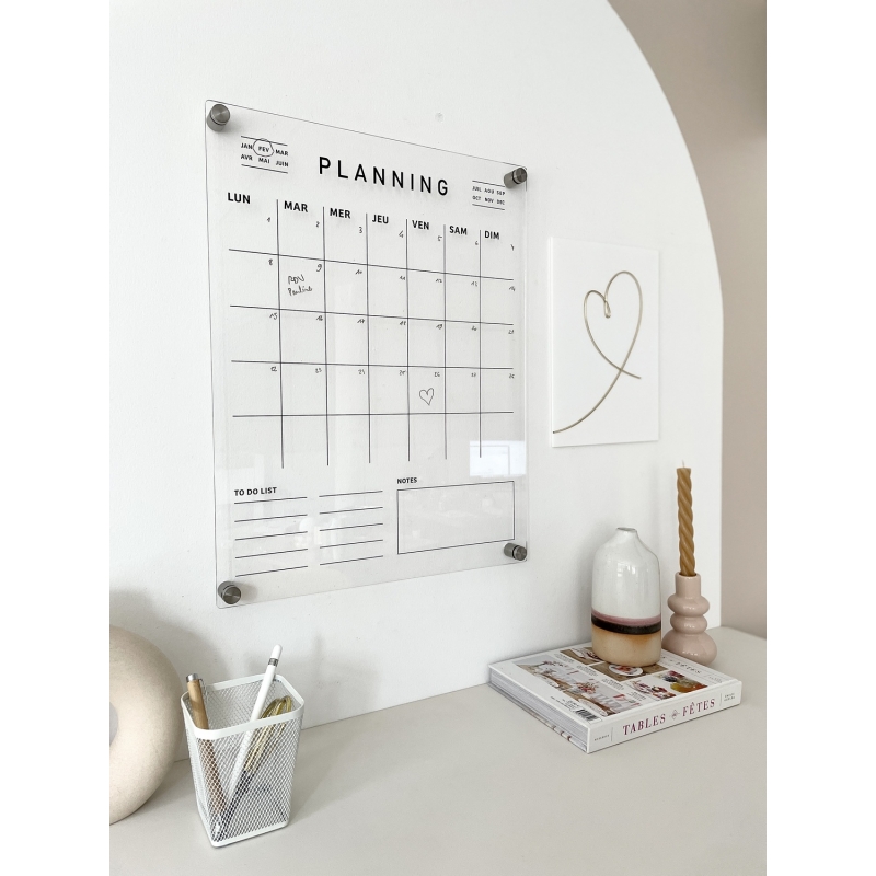 Restez organisé grâce à notre planning mensuel en plexiglas à accrocher au mur. Ce modèle vous plaira pour son design minimaliste et épuré, il s'adaptera facilement à toutes les décorations d'intérieur. C'est un outil fonctionnel, intemporel et idéal pour une gestion efficace de votre emploi du temps, tout en alliant simplicité et fonctionnalité.