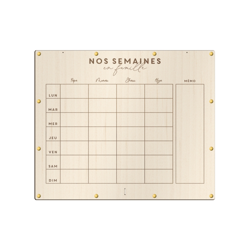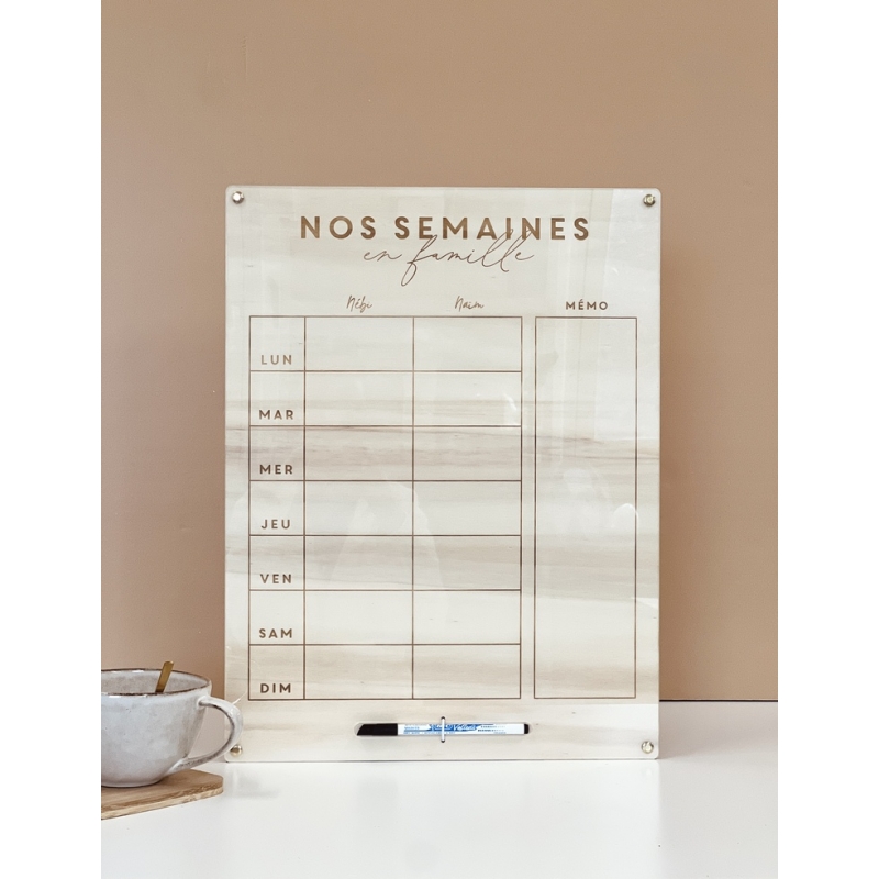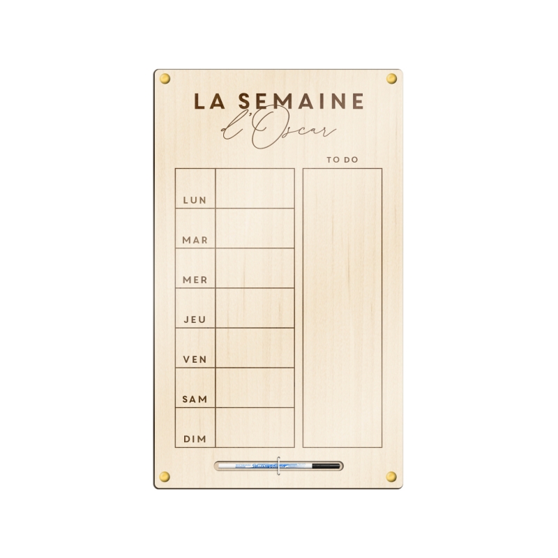 Nous vous proposons un joli planning mural à personnaliser pour toute la famille ! Chaque semaine, vous pourrez inscrire au stylo effaçable l'emploi du temps de chaque membre, un moyen d'avoir un agenda commun et de pouvoir s'organiser au mieux ! Ce semainier en bois est un objet de décoration au design épuré qui pourra s'intégrer parfaitement dans tous les styles de décoration.
