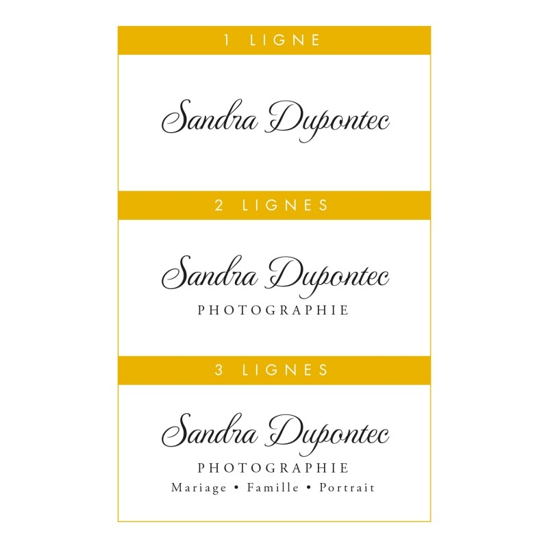 Print Your Love vous propose de réaliser votre tampon encreur professionnel uniquement avec du texte. Pour cela, vous avez la possibilité de choisir la typographie de votre choix, ainsi que le nombre de ligne(s) que vous souhaitez : 1, 2 ou 3 lignes (voir image 2).