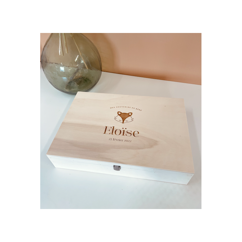 Grâce à ce joli coffret de naissance en bois, vous pourrez conserver les premiers souvenirs de bébé dans un bel écrin. La boîte en bois est finement gravée avec le prénom et les informations de naissance pour un souvenir 100% unique et personnel. Le modèle renard sera parfait pour les amoureux de la forêt et de la nature.