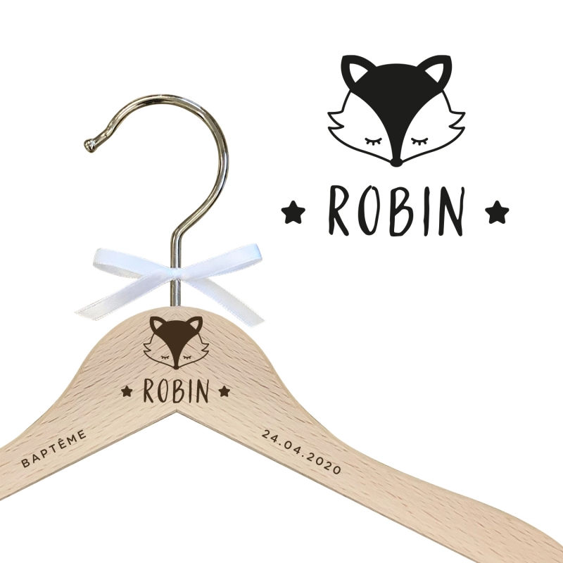 Joli cintre en bois personnalisé avec le prénom de l'enfant au centre et une petite tête de renard. Sur les branches, possibilité d'ajouter une date ou un texte au choix (option à sélectionner dans le menu déroulant).