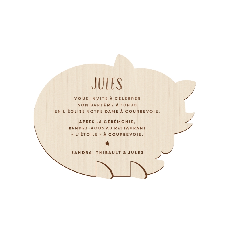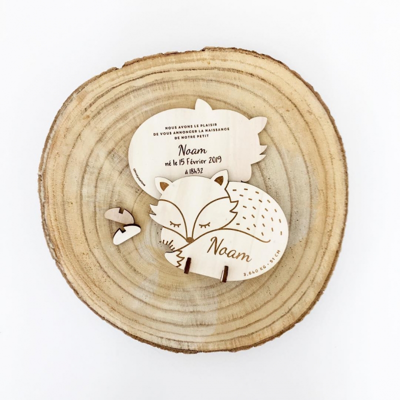 Pour le baptême de votre enfant, envoyez à vos proches des faire-part originaux en bois en forme de renard endormi. Vos invités vont adorer recevoir ce petit animal décoratif en 3D en guise d'invitation !
