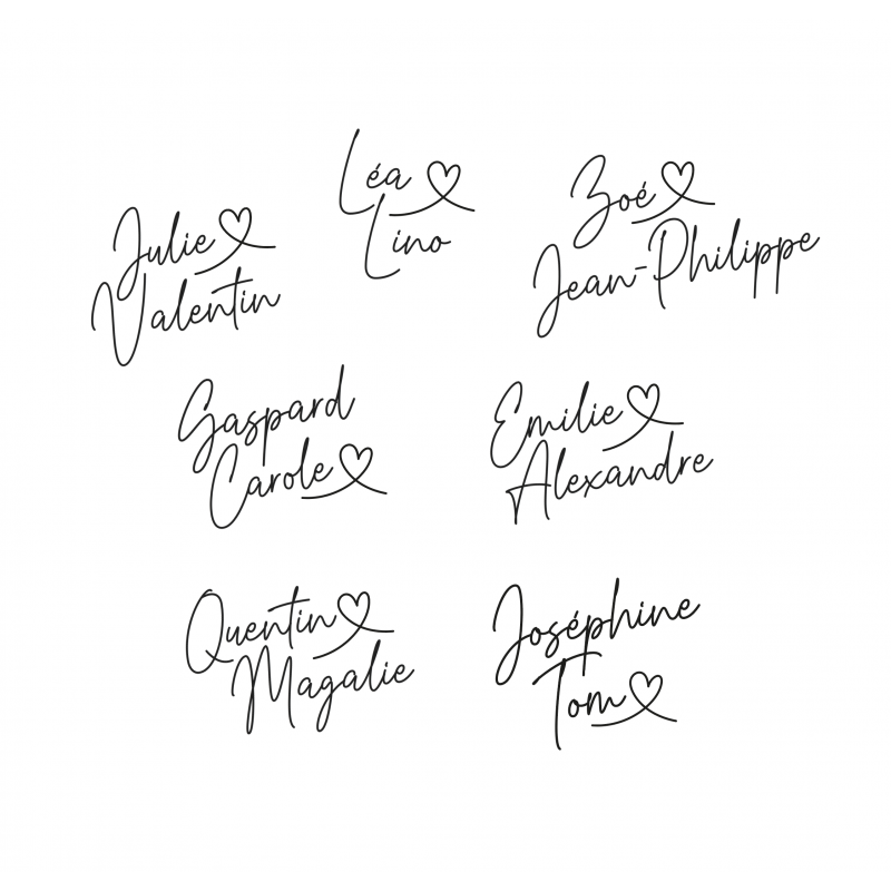 Le tarif comprend la composition graphique des 2 prénoms, ainsi que la découpe selon les matières et le format choisis dans les menus déroulants.
