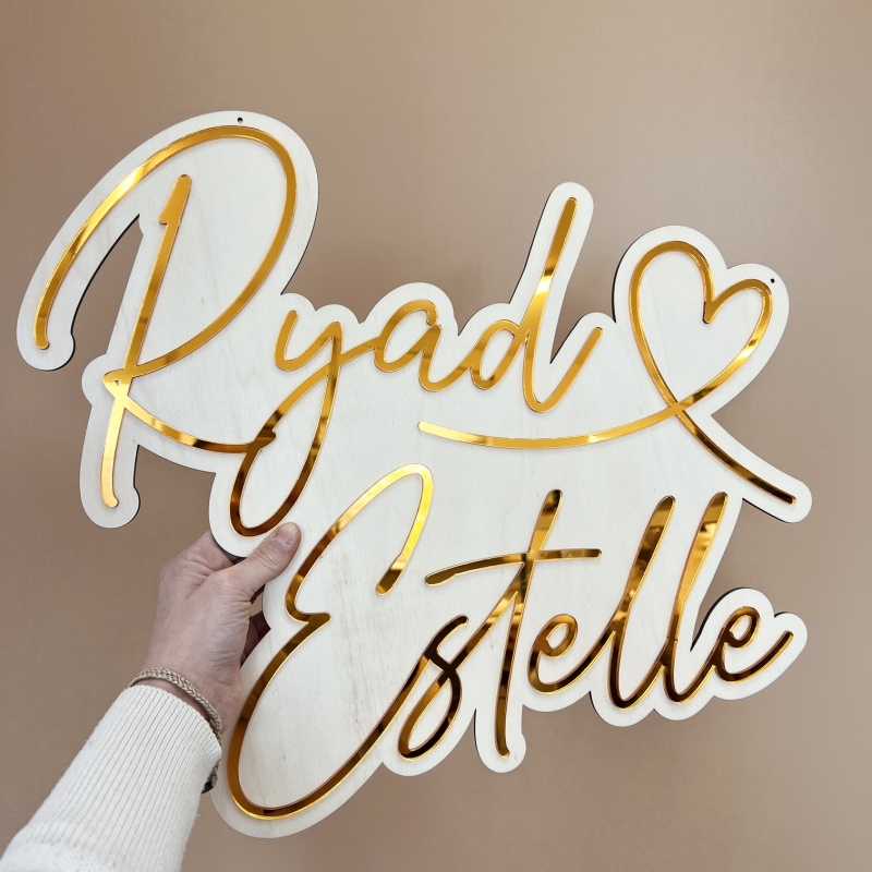 Pour que la composition soit harmonieuse au maximum selon vos prénoms, l'emplacement du coeur peut varier. Nous réalisons l'enseigne sur-mesure et nous nous assurons que le produit final est à la fois harmonieux visuellement et solide pour l’envoi. Vous n'aurez donc pas la même composition que le modèle présenté sur les photos.