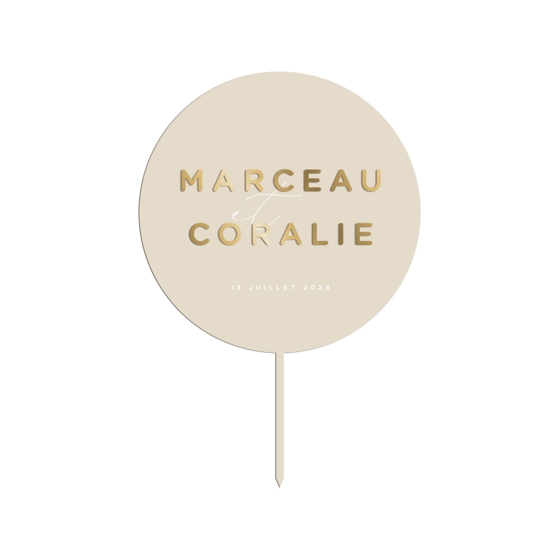 Joli cake topper rond en plexiglas à personnaliser pour votre mariage. Le modèle Stone vous plaira pour son style organique dans des tons neutres. Vos prénoms seront parfaitement mis en valeur grâce au plexiglas ajouté dessus.
